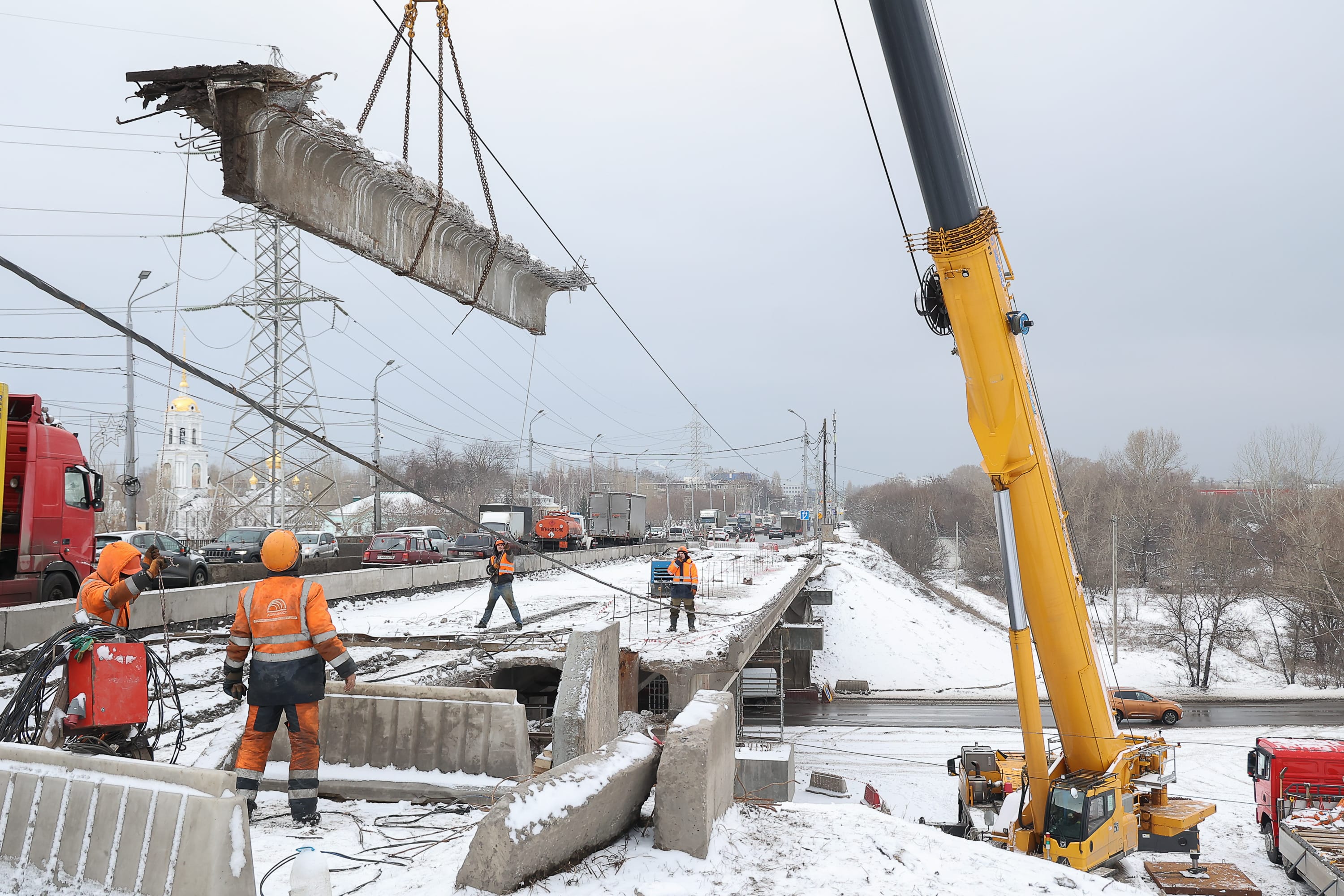 По словам главного инженера компании-подрядчика Сергея Чернова, на объекте для подъема железобетонных конструкций задействован кран грузоподъемностью до 230 т, а также бригада рабочих — до 15 человек в смену.