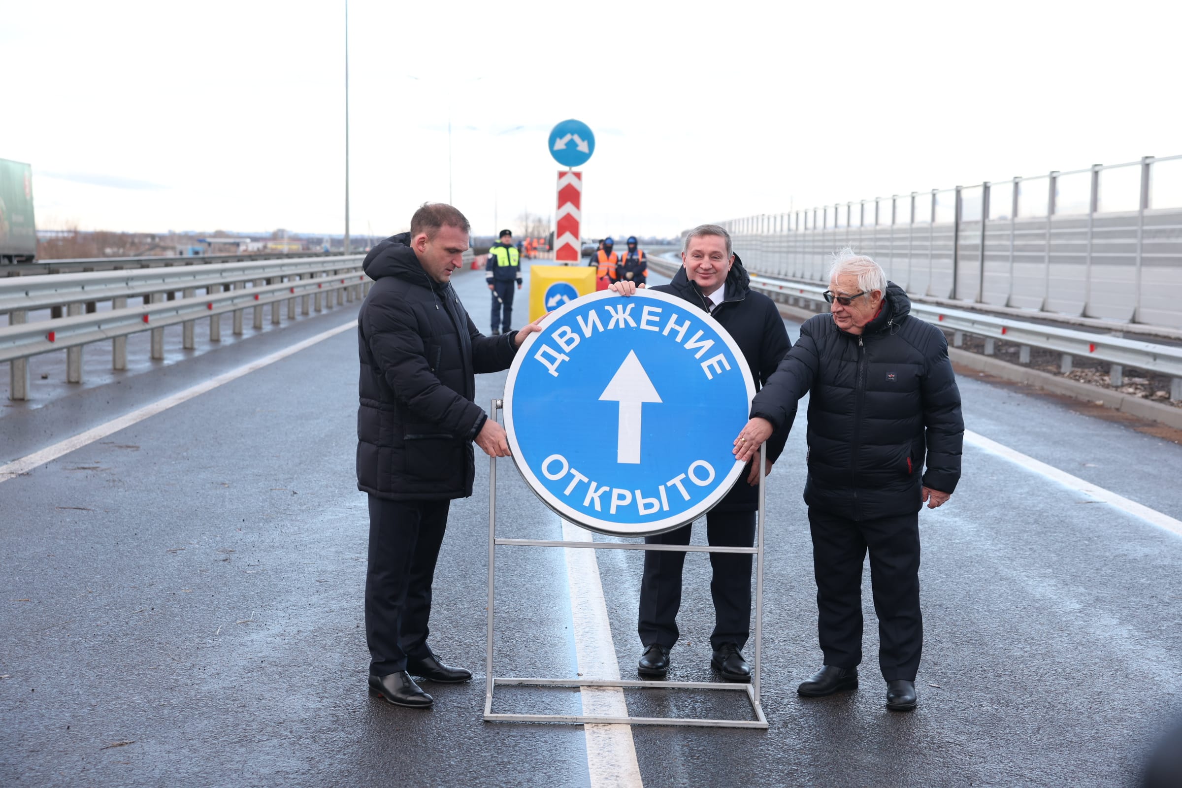 Знак «Движение открыто» перевернули губернатор Волгоградской области Андрей Бочаров и Почетный строитель Российской Федерации член Общественной палаты Волгоградской области Лев Алферов, который стоял у истоков этого проекта много лет назад.